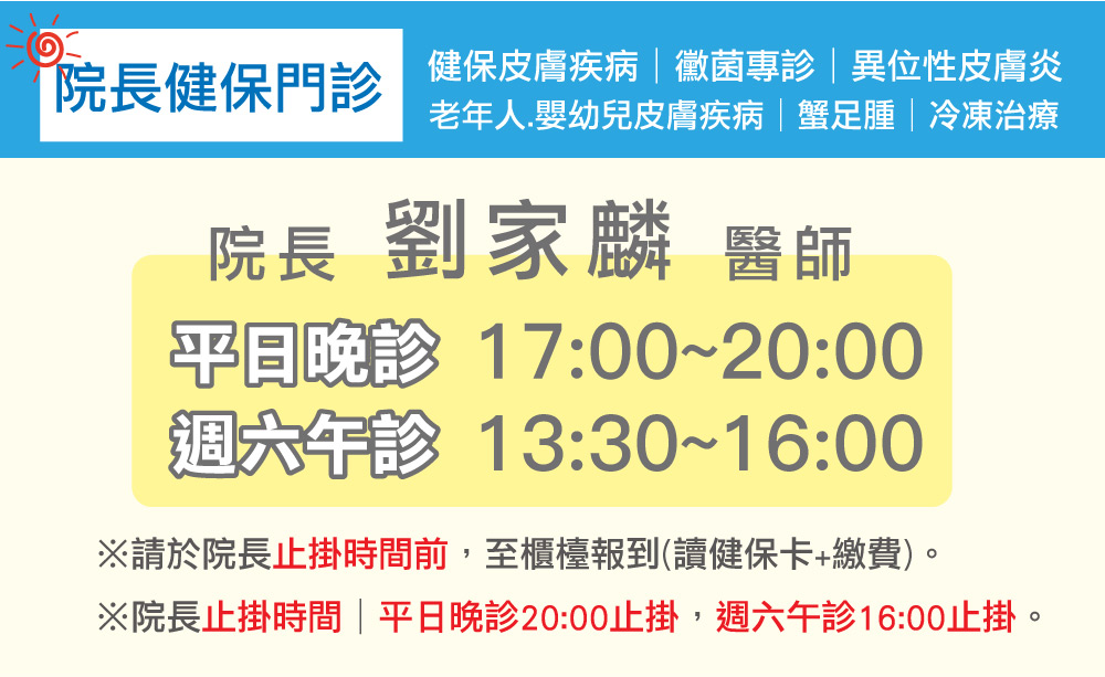 ◉院長平日晚診止掛時間20:00、週六午診止掛時間16:00。請您務必於止掛時間內報到。