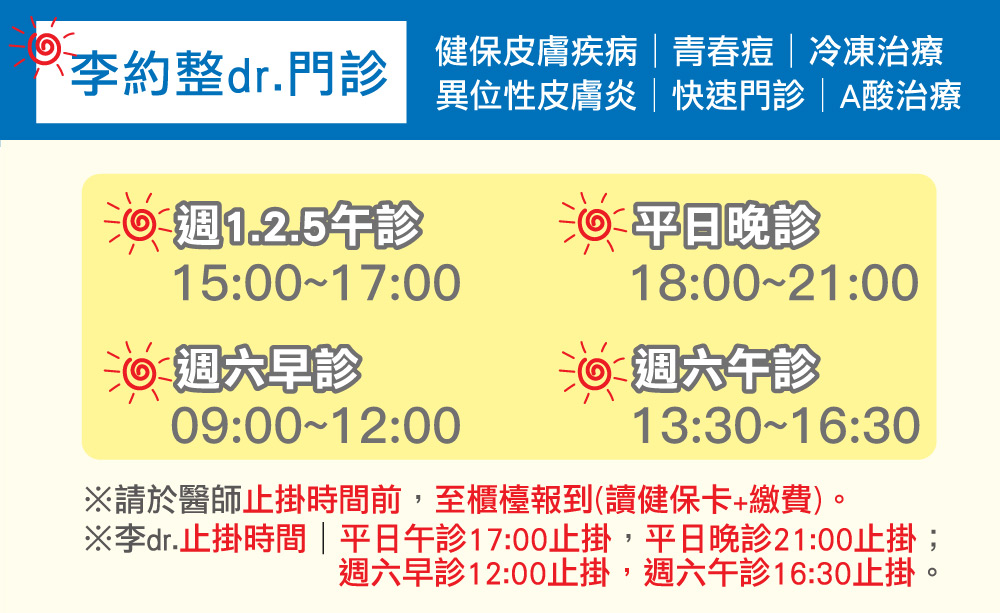 ◉李約整醫師:平日午診止掛時間17:00、平日晚診止掛時間21:00、週六早診止掛時間12:00、週六午診止掛時間16:30。請您務必於止掛時間內報到。