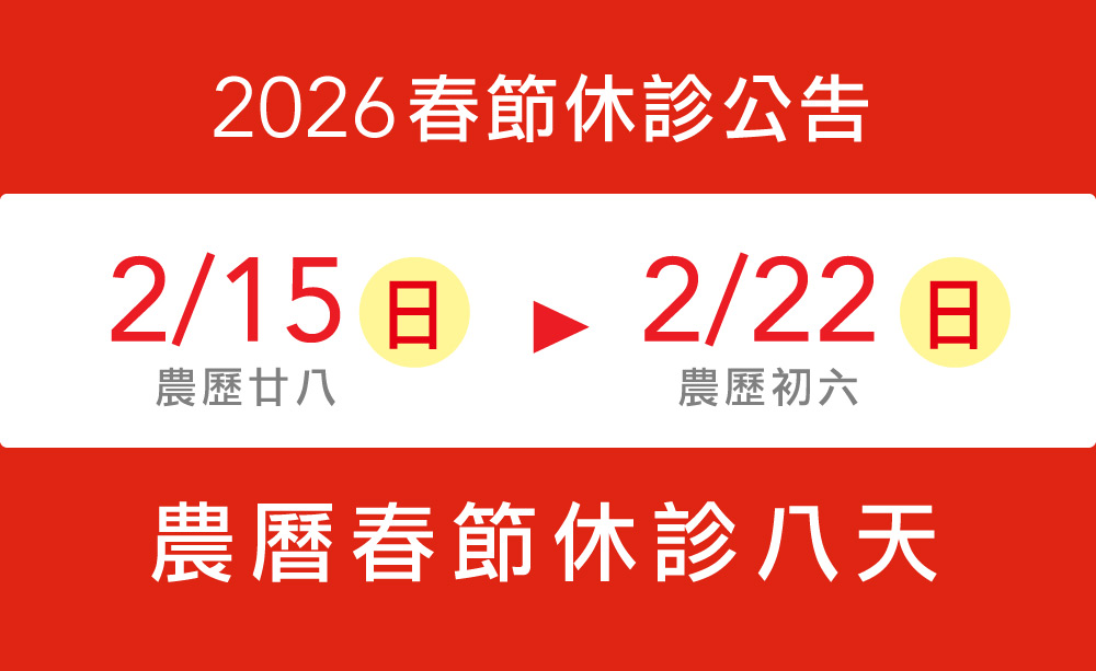─春節休診【2/15(日)廿八~02/22(日)初六春節休診8天】