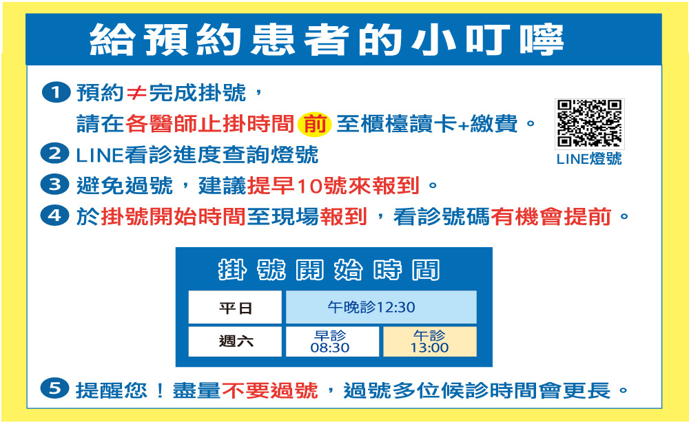 * 預約只是幫您保留一個看診號碼,請於各醫師『止掛時間前』至櫃檯讀卡+繳費。